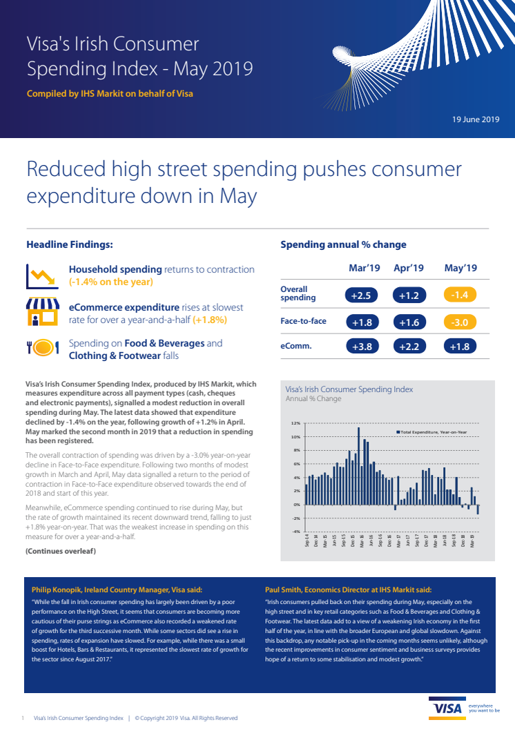 Visa’s Irish Consumer Spending Index, produced by IHS Markit, which measures expenditure across all payment types (cash, cheques and electronic payments), signalled a modest reduction in overall spending during May. The latest data showed that expenditure declined by -1.4% on the year, following growth of +1.2% in April.
