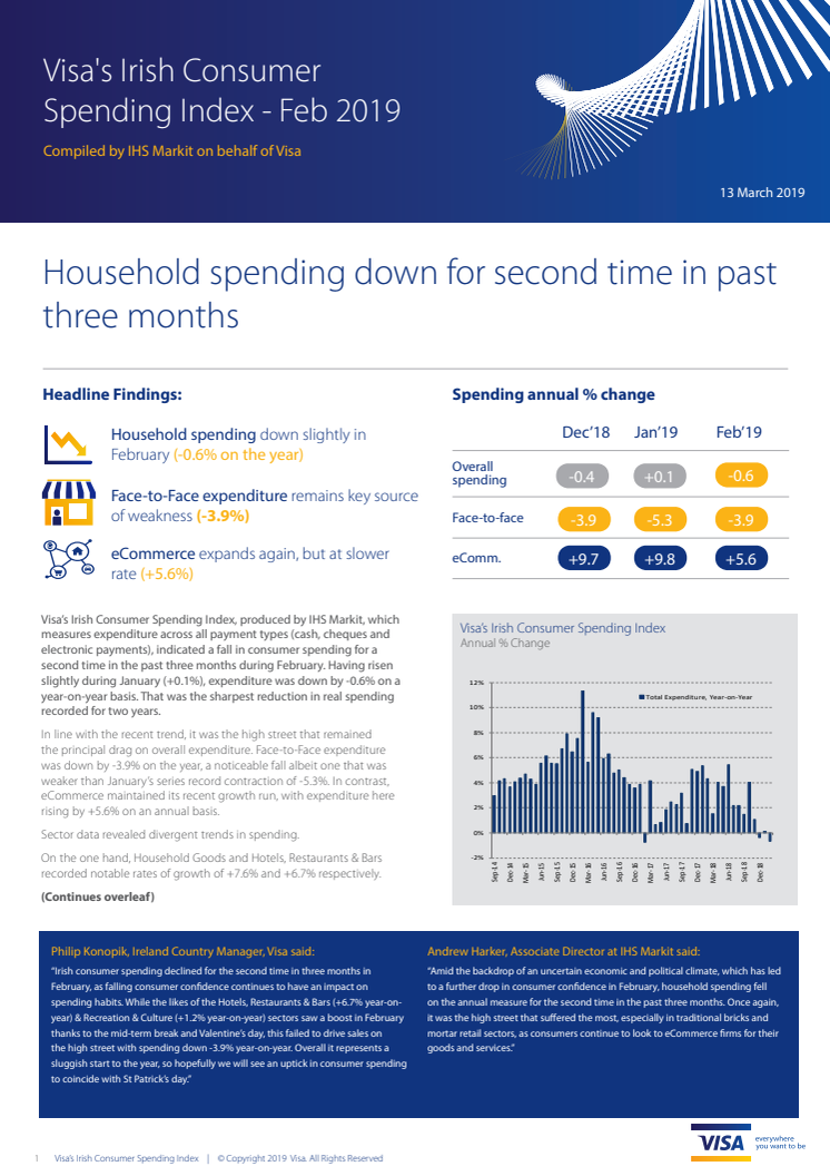 Visa’s Irish Consumer Spending Index, produced by IHS Markit, which measures expenditure across all payment types (cash, cheques and electronic payments), indicated a fall in consumer spending for a second time in the past three months during February. Having risen slightly during January (+0.1%), expenditure was down by -0.6% on a year-on-year basis.