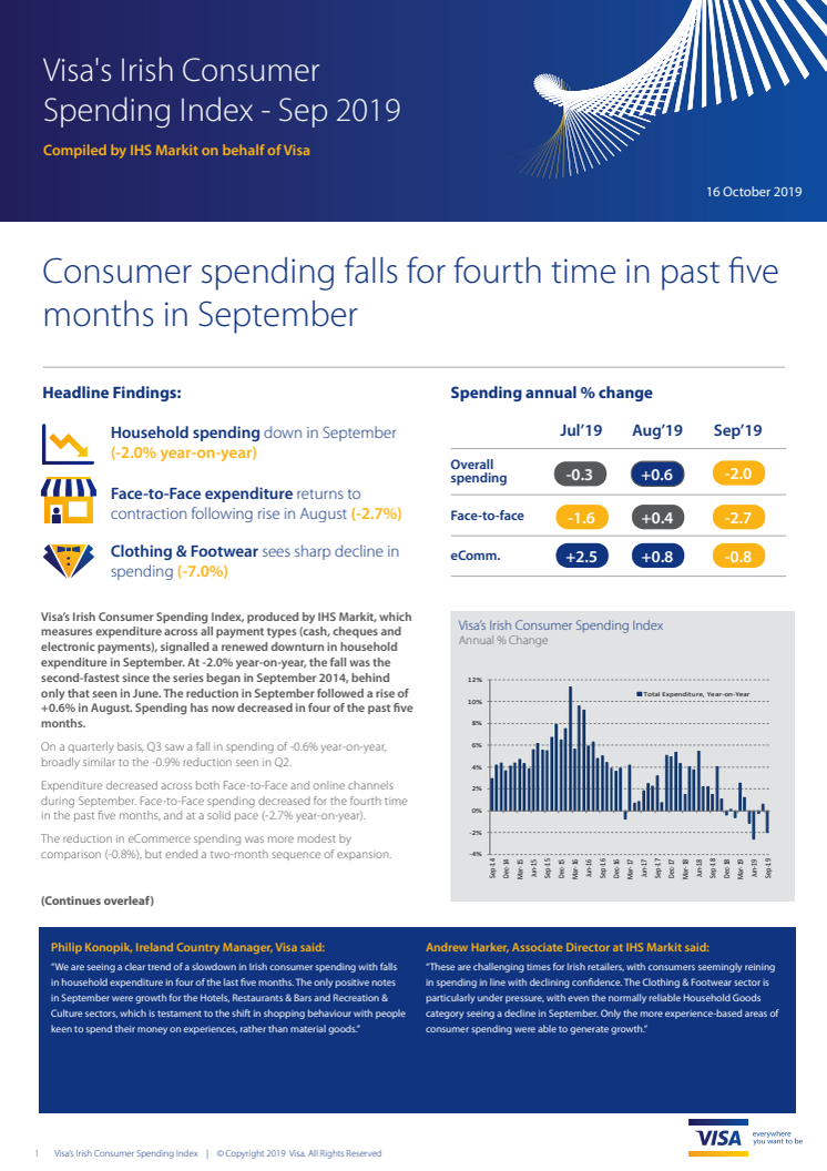 Visa’s Irish Consumer Spending Index, produced by IHS Markit, which measures expenditure across all payment types (cash, cheques and electronic payments), signalled a renewed downturn in household expenditure in September. At -2.0% year-on-year, the fall was the second-fastest since the series began in September 2014, behind only that seen in June.