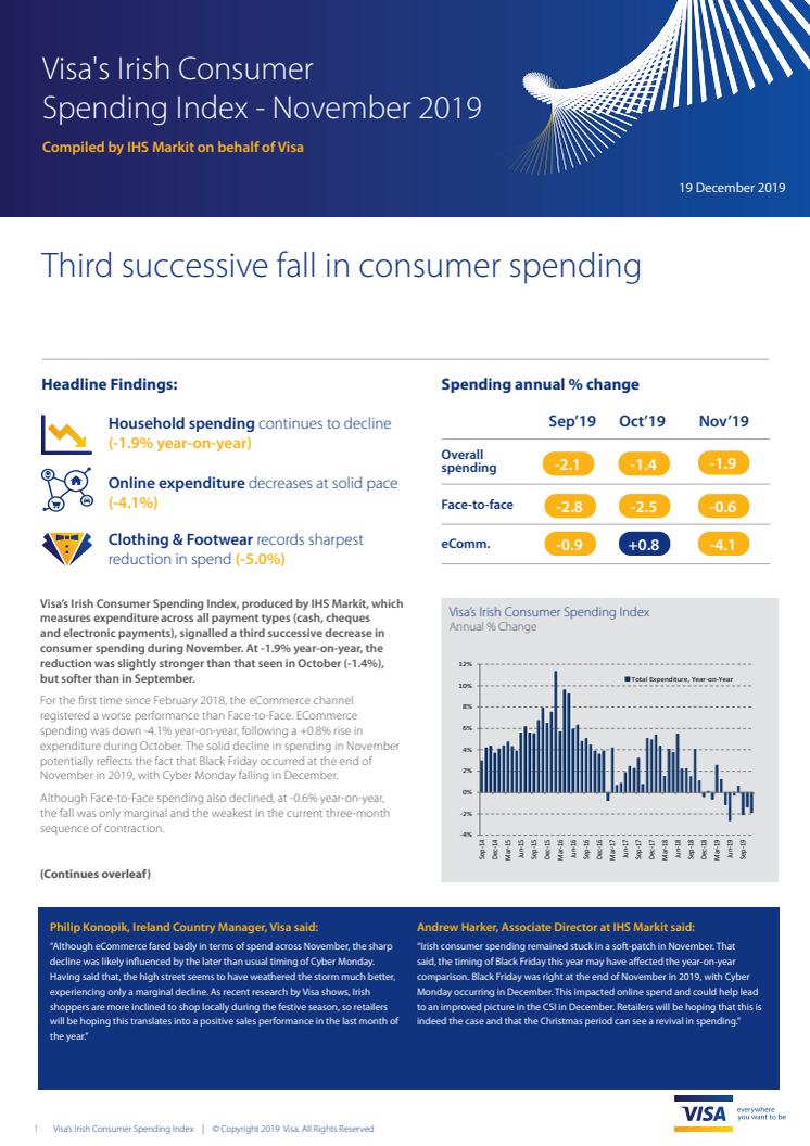 Visa’s Irish Consumer Spending Index, produced by IHS Markit, which measures expenditure across all payment types (cash, cheques and electronic payments), signalled a third successive decrease in consumer spending during November. At -1.9% year-on-year, the reduction was slightly stronger than that seen in October (-1.4%),