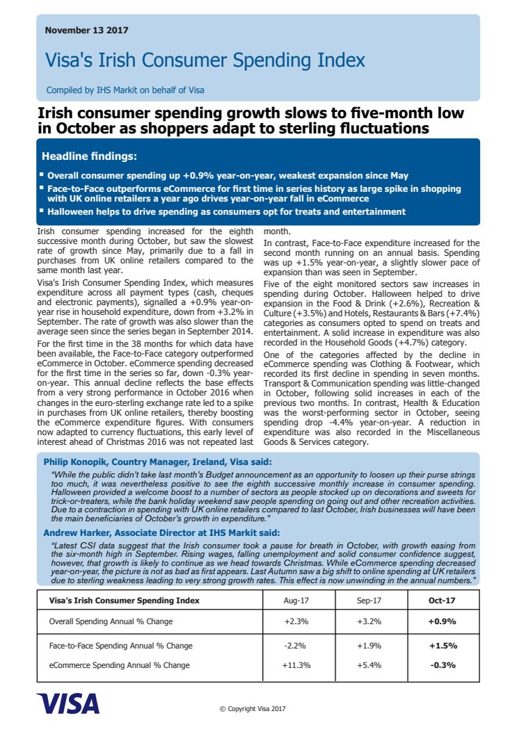 Irish consumer spending increased for the eighth successive month during October, but saw the slowest rate of growth since May, primarily due to a fall in purchases from UK online retailers compared to the same month last year.