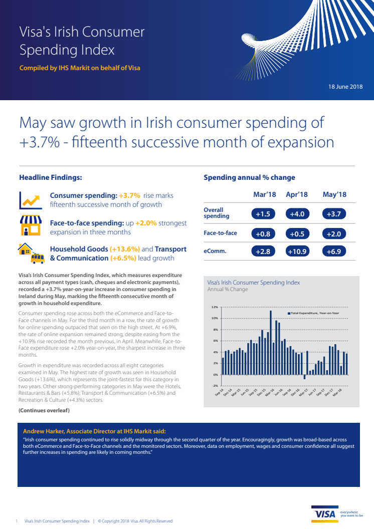 Dublin, 18 June 2018: Visa’s Irish Consumer Spending Index, which measures expenditure across all payment types (cash, cheques and electronic payments), recorded a +3.7% year-on-year increase in consumer spending in Ireland during May, marking the fifteenth consecutive month of growth in household expenditure