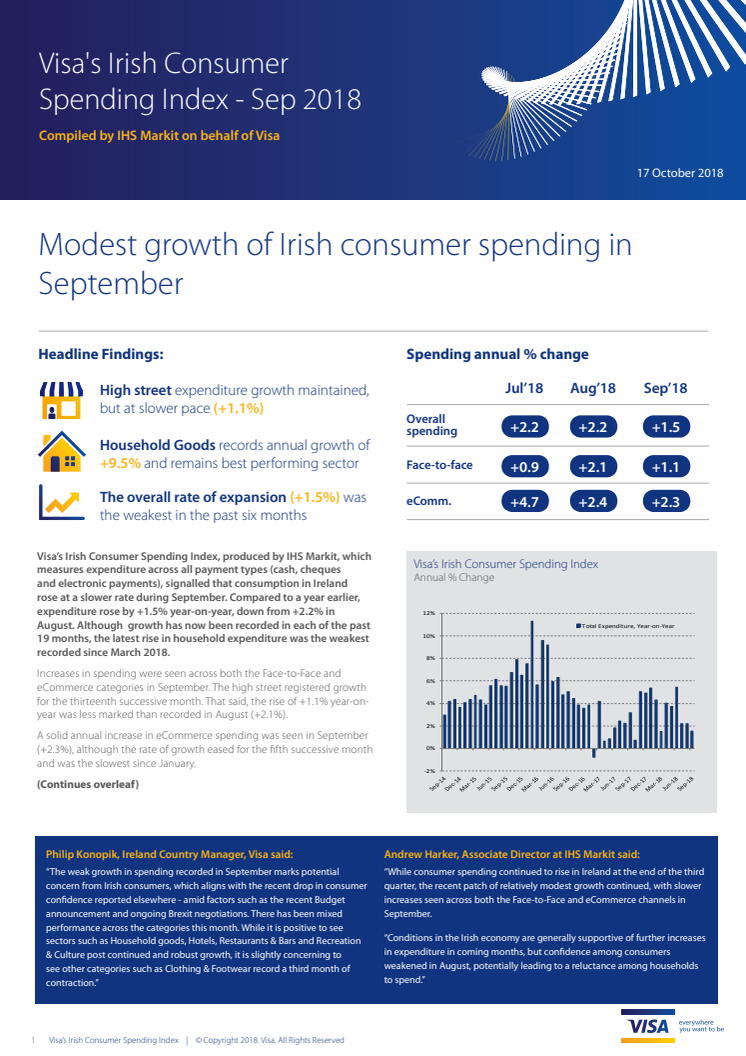 Visa’s Irish Consumer Spending Index, produced by IHS Markit, which measures expenditure across all payment types (cash, cheques and electronic payments), has revealed that spending in Ireland rose at a slower rate during September, ahead of the 2019 Government Budget being announced.