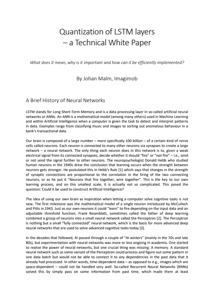 This white paper explains what LSTM layers are, why they are important and what the technical solution Imagimob AI looks like. In Imagimob AI, quantization of a pretrained model is done with the click of a button in a user-friendly graphical user interface, which generates C code without any floating-point operations, ready for deployment.