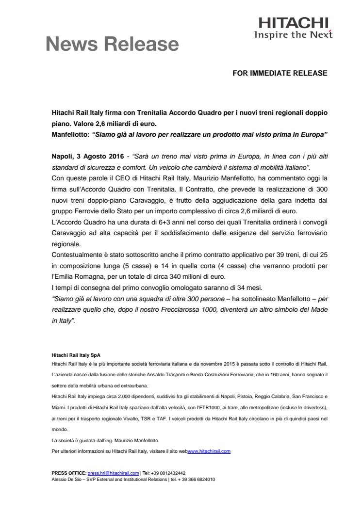 Con queste parole il CEO di Hitachi Rail Italy, Maurizio Manfellotto, ha commentato oggi la firma sull’Accordo Quadro con Trenitalia. Il Contratto, che prevede la realizzazione di 300 nuovi treni doppio-piano Caravaggio, è frutto della aggiudicazione della gara indetta dal gruppo Ferrovie dello Stato per un importo complessivo di circa 2,6 miliardi di euro.