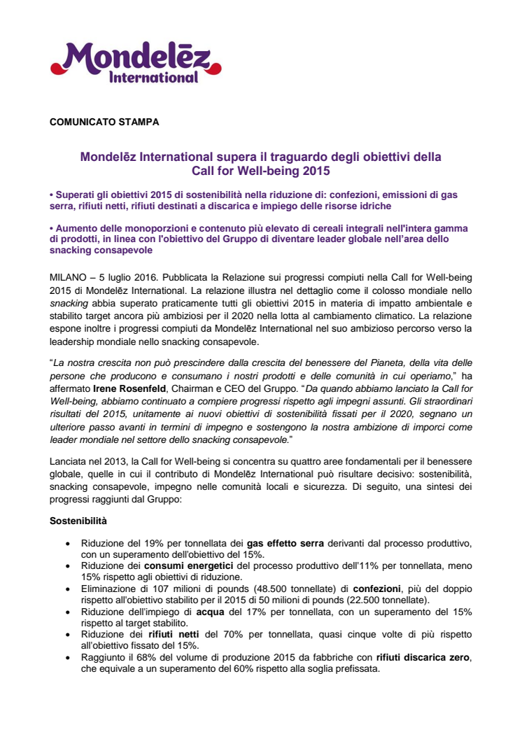 Mondelēz International supera il traguardo degli obiettivi della Call for Well-being 2015