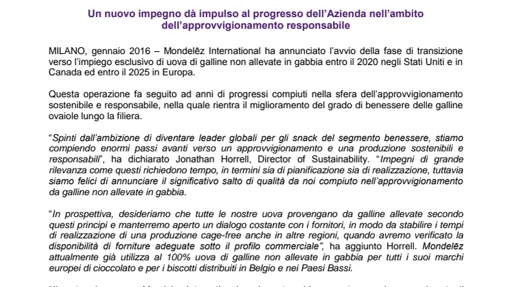 MILANO, gennaio 2016 – Mondelēz International ha annunciato l’avvio della fase di transizione verso l’impiego esclusivo di uova di galline non allevate in gabbia entro il 2020 negli Stati Uniti e in Canada ed entro il 2025 in Europa.