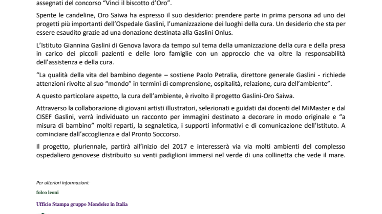 Prosegue l’amicizia tra l’Istituto Gaslini di Genova e Oro Saiwa, brand del gruppo Mondelez in Italia, iniziata in occasione del sessantesimo compleanno del notissimo biscotto, per il quale era stata avviata una prima collaborazione che aveva preso forma con l’inserimento del logo dell’Ospedale pediatrico su più di 20 milioni di confezioni del prodotto e con la donazione dei premi non assegnati del concorso “Vinci il biscotto d’Oro”.