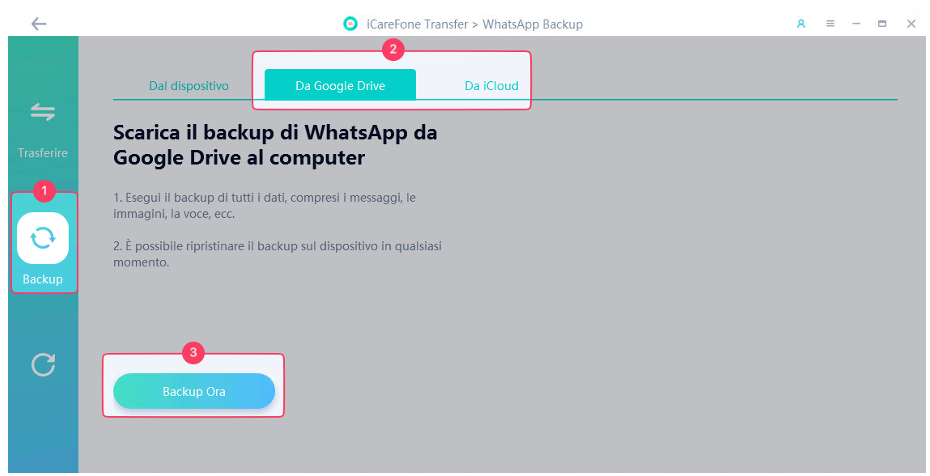- Clicca sul pulsante [Backup Ora] per creare il backup di WhatsApp.