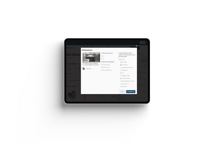 Una volta completate le loro selezioni, gli utenti possono comodamente scaricare un pacchetto progetto con informazioni dettagliate su i prodotti , inclusa tutta la documentazione necessaria tipicamente richiesta dai professionisti, come dichiarazioni ambientali sui prodotti, file BIM, schede tecniche e altro ancora.