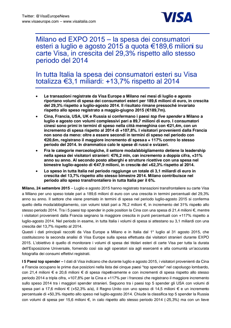 Milano ed EXPO 2015 – la spesa dei consumatori esteri a luglio e agosto 2015 a quota €189,6 milioni su carte Visa, in crescita del 29,3% rispetto allo stesso periodo del 2014