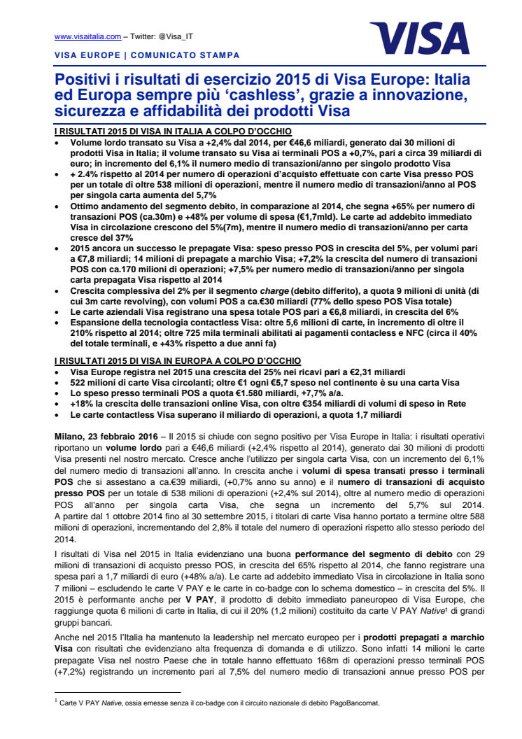 Positivi i risultati di esercizio 2015 di Visa Europe: Italia ed Europa sempre più ‘cashless’, grazie a innovazione, sicurezza e affidabilità dei prodotti Visa