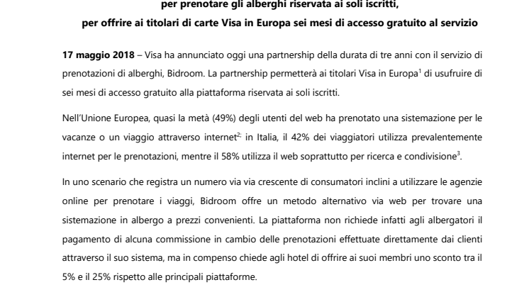 17 maggio 2018– Visa ha annunciato oggi una partnership della durata di tre anni con il servizio di prenotazioni di alberghi, Bidroom. La partnership permetterà ai titolari Visa in Europa1 di usufruire di sei mesi di accesso gratuito alla piattaforma riservata ai soli iscritti.