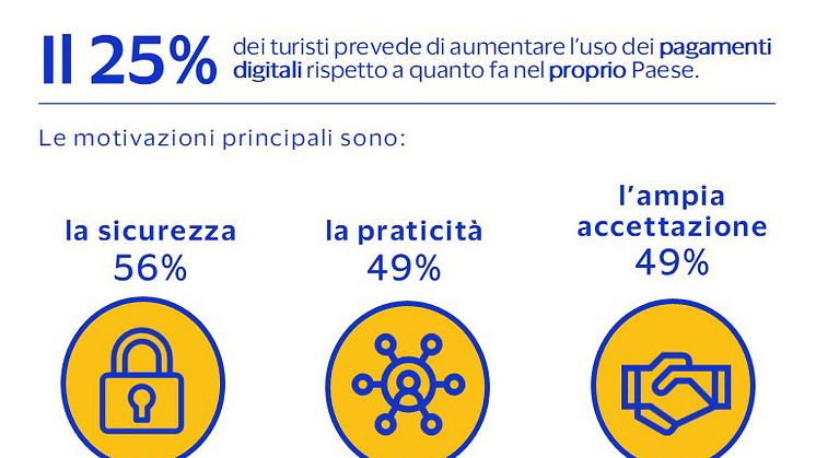 Il 25% dei turisti prevede di utilizzare soluzioni di pagamento digitale in misura maggiore rispetto a quanto fa nel proprio Paese di origine. Sicurezza (56%), comodità (49%) e ampia accettazione (49%) sono le ragioni alla base di questa scelta.