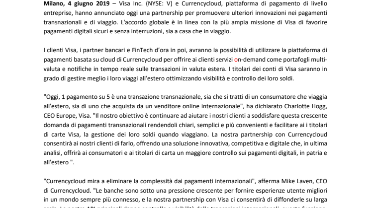 Milano, 4 giugno 2019 – Visa Inc. (NYSE: V) e Currencycloud, piattaforma di pagamento di livello entreprise, hanno annunciato oggi una partnership per promuovere ulteriori innovazioni nei pagamenti transnazionali e di viaggio. L'accordo globale è in linea con la più ampia missione di Visa di favorire pagamenti digitali sicuri e senza interruzioni, sia a casa che in viaggio.