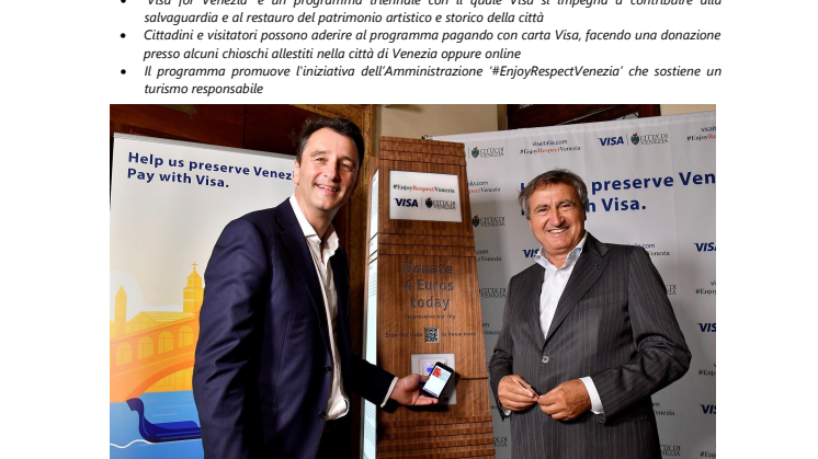 - ‘Visa for Venezia’ è un programma triennale con il quale Visa si impegna a contribuire alla salvaguardia e al restauro del patrimonio artistico e storico della città
