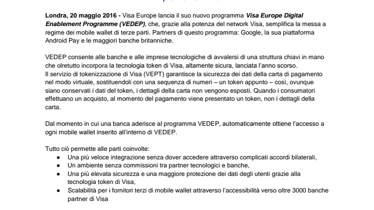 Londra, 20 maggio 2016 - Visa Europe lancia il suo nuovo programma Visa Europe Digital Enablement Programme (VEDEP), che, grazie alla potenza del network Visa, semplifica la messa a regime dei mobile wallet di terze parti. Partners di questo programma: Google, la sua piattaforma Android Pay e le maggiori banche britanniche.