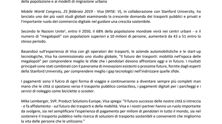 Mobile World Congress, 25 febbraio 2019 - Visa (NYSE: V), in collaborazione con Stanford University, ha lanciato uno dei più vasti studi globali esaminando la crescente domanda dei trasporti pubblici e privati e l'importante ruolo del commercio digitale nel guidare una crescita sostenibile.