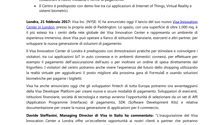 Davide Steffanini, Managing Director di Visa in Italia ha commentato: “L’inaugurazione del Visa Innovation Center a Londra offre un’eccellente opportunità ai nostri clienti e partner che potranno accedere in maniera privilegiata alle nostre più avanzate funzionalità di pagamento, contribuendo fattivamente allo sviluppo dei pagamenti digitali in Italia.”