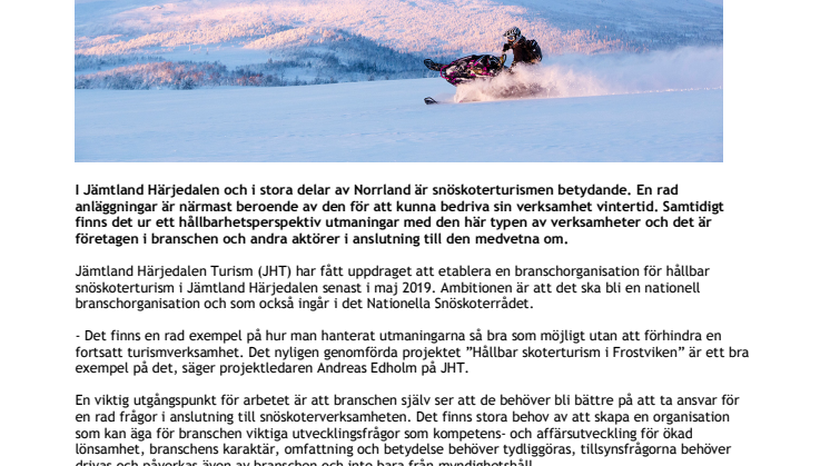 Jämtland Härjedalen Turism (JHT) har fått uppdraget att etablera en branschorganisation för hållbar snöskoterturism i Jämtland Härjedalen senast i maj 2019. Ambitionen är att det ska bli en nationell branschorganisation och som också ingår i det Nationella Snöskoterrådet.