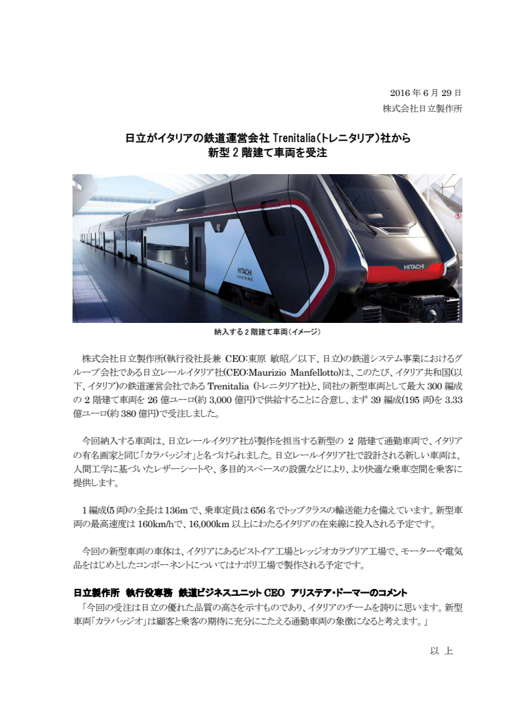 株式会社日立製作所(執行役社長兼CEO:東原 敏昭/以下、日立)の鉄道システム事業におけるグループ会社である日立レールイタリア社(CEO:Maurizio Manfellotto)は、このたび、イタリア共和国(以下、イタリア)の鉄道運営会社であるTrenitalia (トレニタリア社)と、同社の新型車両として最大300編成の2階建て車両を26億ユーロ(約3,000億円)で供給することに合意し、まず39編成(195両)を3.33億ユーロ(約380億円)で受注しました。