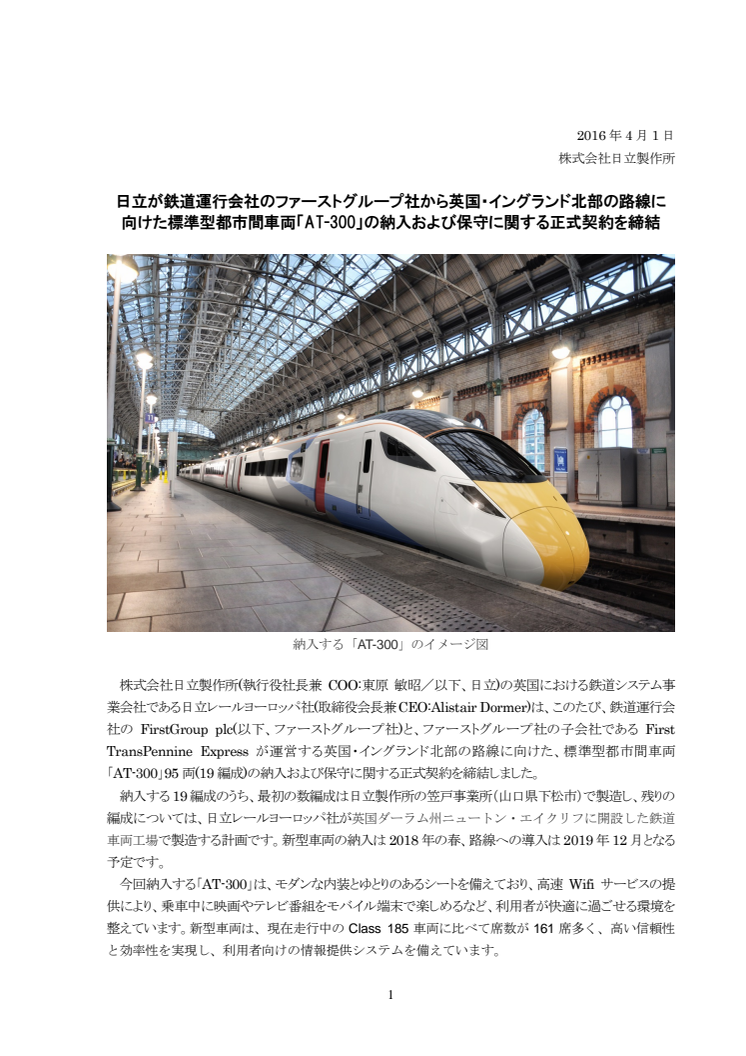 株式会社日立製作所(執行役社長兼COO:東原 敏昭/以下、日立)の英国における鉄道システム事業会社である日立レールヨーロッパ社(取締役会長兼CEO:Alistair Dormer)は、このたび、鉄道運行会社のFirstGroup plc(以下、ファーストグループ社)と、ファーストグループ社の子会社であるFirst TransPennine Expressが運営する英国・イングランド北部の路線に向けた、標準型都市間車両「AT-300」95両(19編成)の納入および保守に関する正式契約を締結しました。