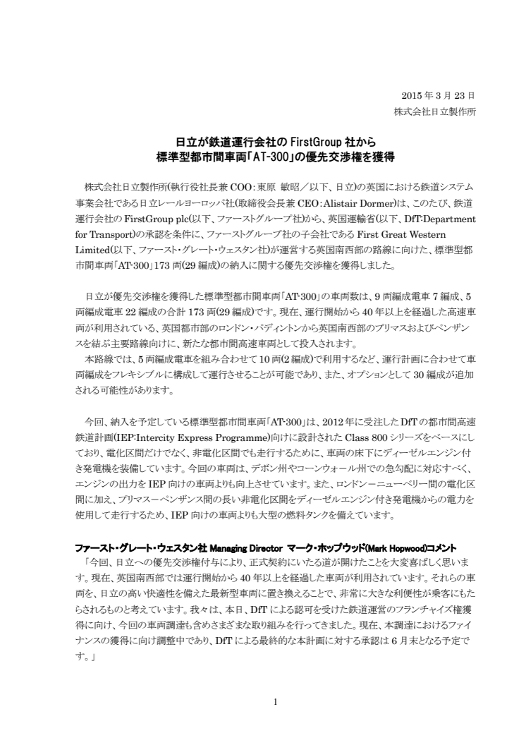 「今回、納入する電気・ディーゼル併用仕様の標準型都市間車両「AT-300」は、Great Western Main Line(GWML)とEast Coast Main Line(ECML)向けに開発されたClass800シリーズを、プリマスからペンザンスを結ぶ路線向けに改良したものです。本車両は、多くのユーザーからのフィードバックを生かし、短距離から長距離の移動までを乗客が快適に過ごせるような利便性の向上を図っています。今回、ファーストグループ社から優先交渉権を得られたことは、既に築かれている日立との関係をより強固なものにするもので、2018年以降の運行開始に向け、車両の製造・納入を進めるべく、両社で正式契約に向けた交渉を進めていきます。」