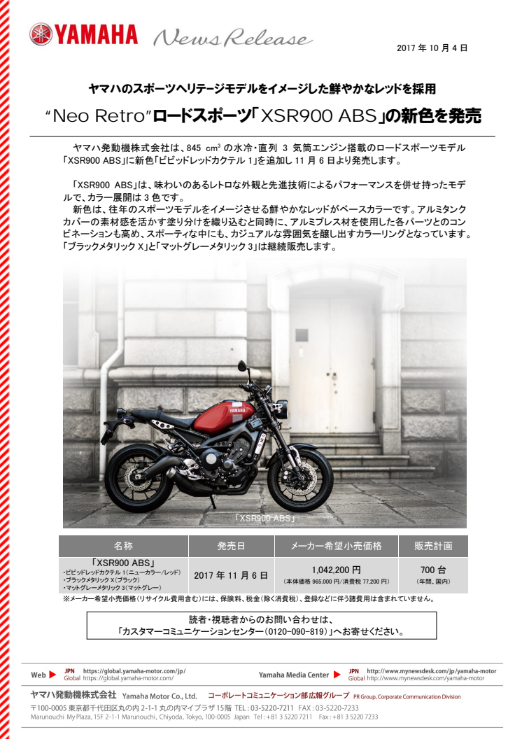 “Neo Retro”ロードスポーツ「XSR900 ABS」の新色を発売 ヤマハのスポーツヘリテージモデルをイメージした鮮やかなレッドを採用