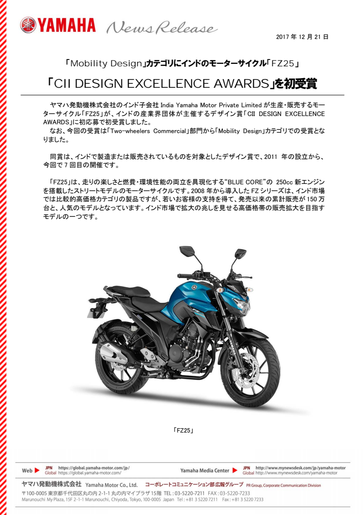 「CII DESIGN EXCELLENCE AWARDS」を初受賞 「Mobility Design」カテゴリにインドのモーターサイクル「FZ25」
