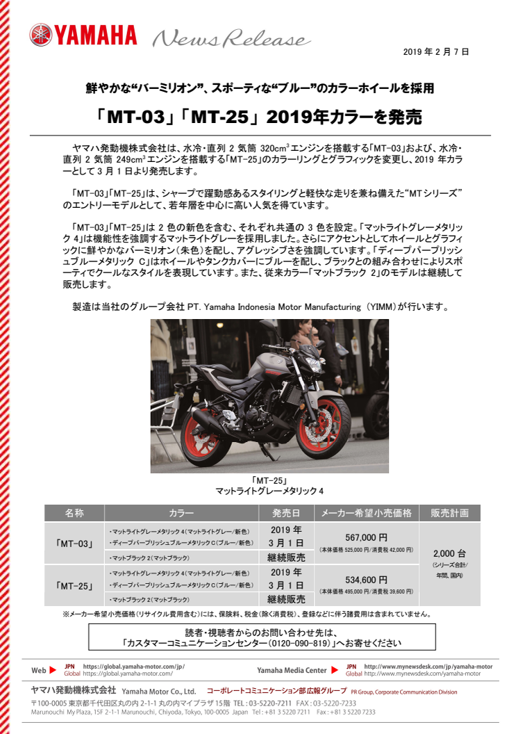 「MT-03」 「MT-25」 2019年カラーを発売 鮮やかな“バーミリオン”、スポーティな“ブルー”のカラーホイールを採用
