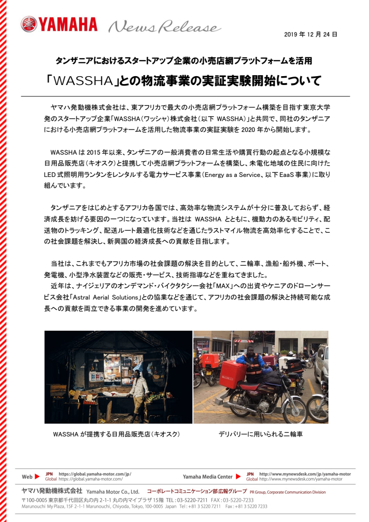 「WASSHA」との物流事業の実証実験開始について タンザニアにおけるスタートアップ企業の小売店網プラットフォームを活用