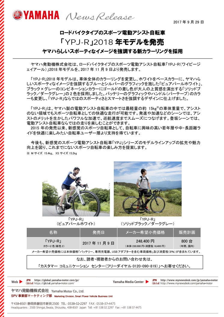 「YPJ-R」2018年モデルを発売 ロードバイクタイプのスポーツ電動アシスト自転車 ヤマハらしいスポーティなイメージを強調する新カラーリングを採用
