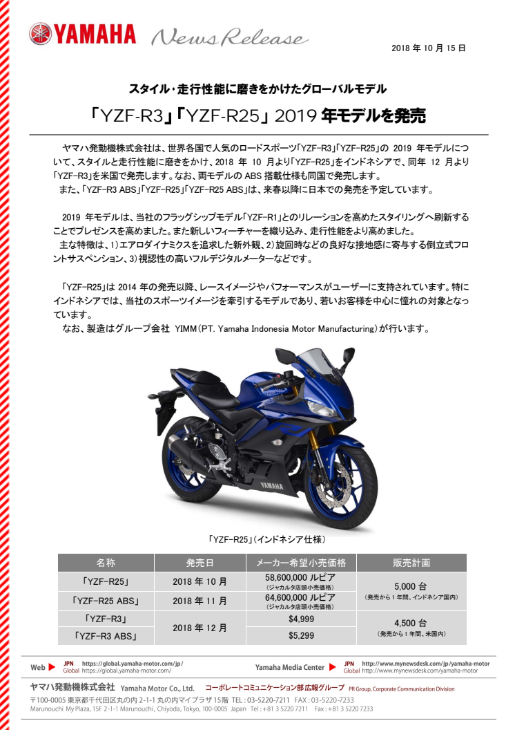 「YZF-R3」 「YZF-R25」 2019年モデルを発売 スタイル・走行性能に磨きをかけたグローバルモデル