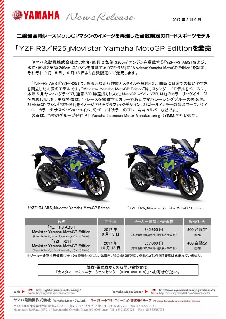 「YZF-R3/R25」Movistar Yamaha MotoGP Editionを発売 二輪最高峰レースMotoGPマシンのイメージを再現した台数限定のロードスポーツモデル