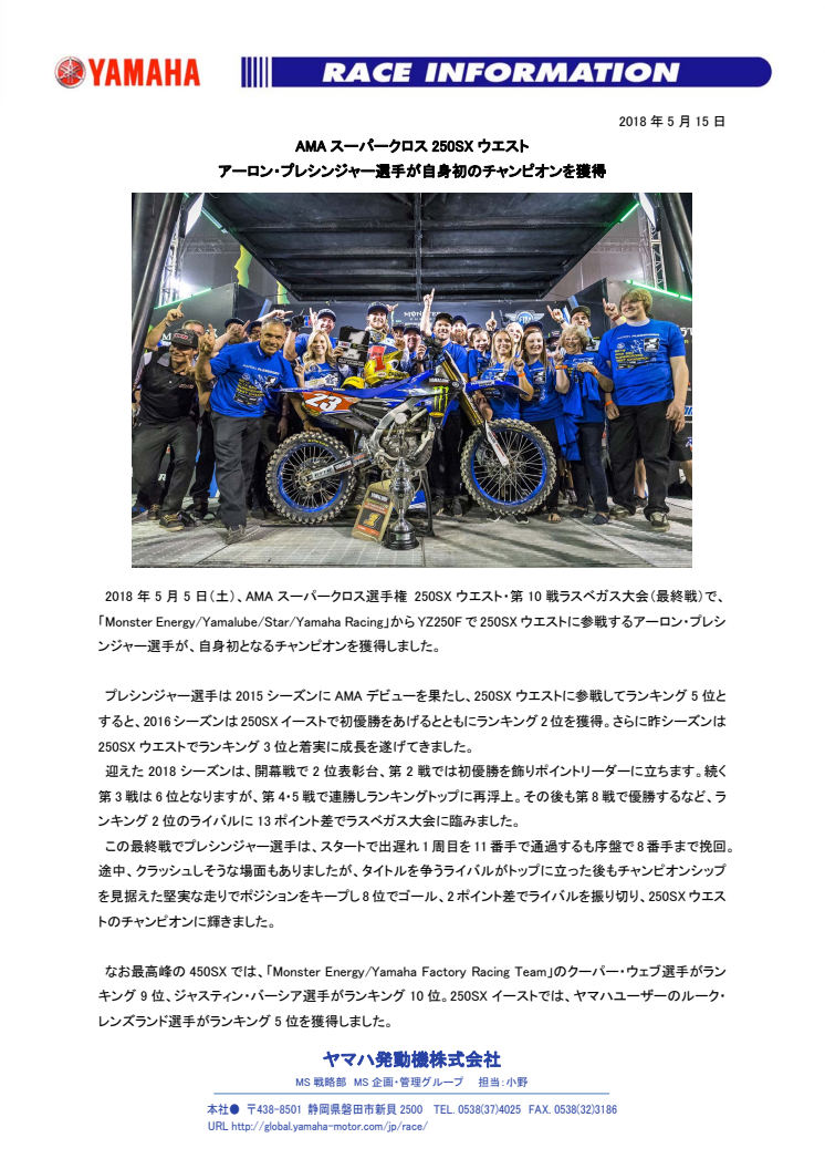 アーロン・プレシンジャー選手が自身初のチャンピオンを獲得 AMAスーパークロス250SXウエスト