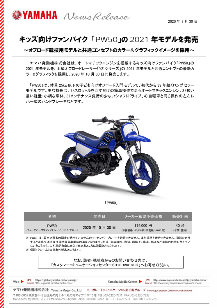 キッズ向けファンバイク 「PW50」の2021年モデルを発売 〜オフロード競技用モデルと共通コンセプトのカラー&グラフィックイメージを採用〜