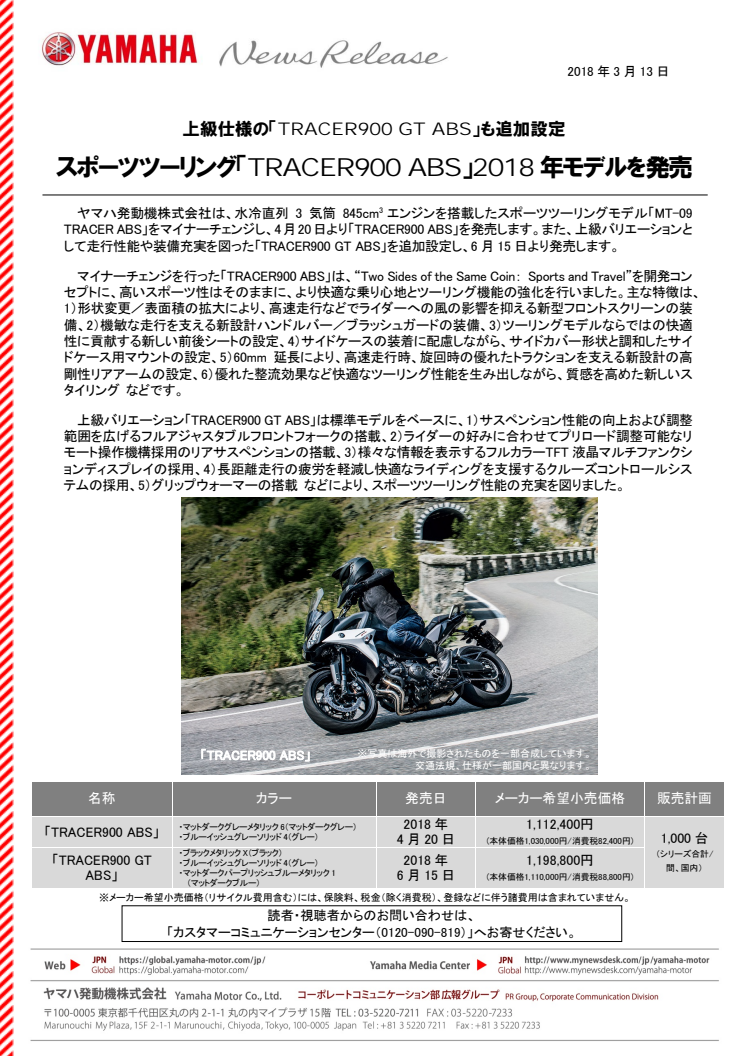 スポーツツーリング「TRACER900 ABS」2018年モデルを発売 上級仕様の「TRACER900 GT ABS」も追加設定