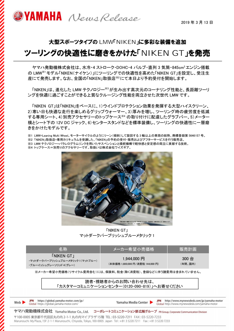 ツーリングの快適性に磨きをかけた「NIKEN GT」を発売 大型スポーツタイプのLMW「NIKEN」に多彩な装備を追加