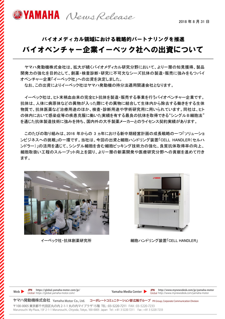 バイオベンチャー企業イーベック社への出資について バイオメディカル領域における戦略的パートナリングを推進