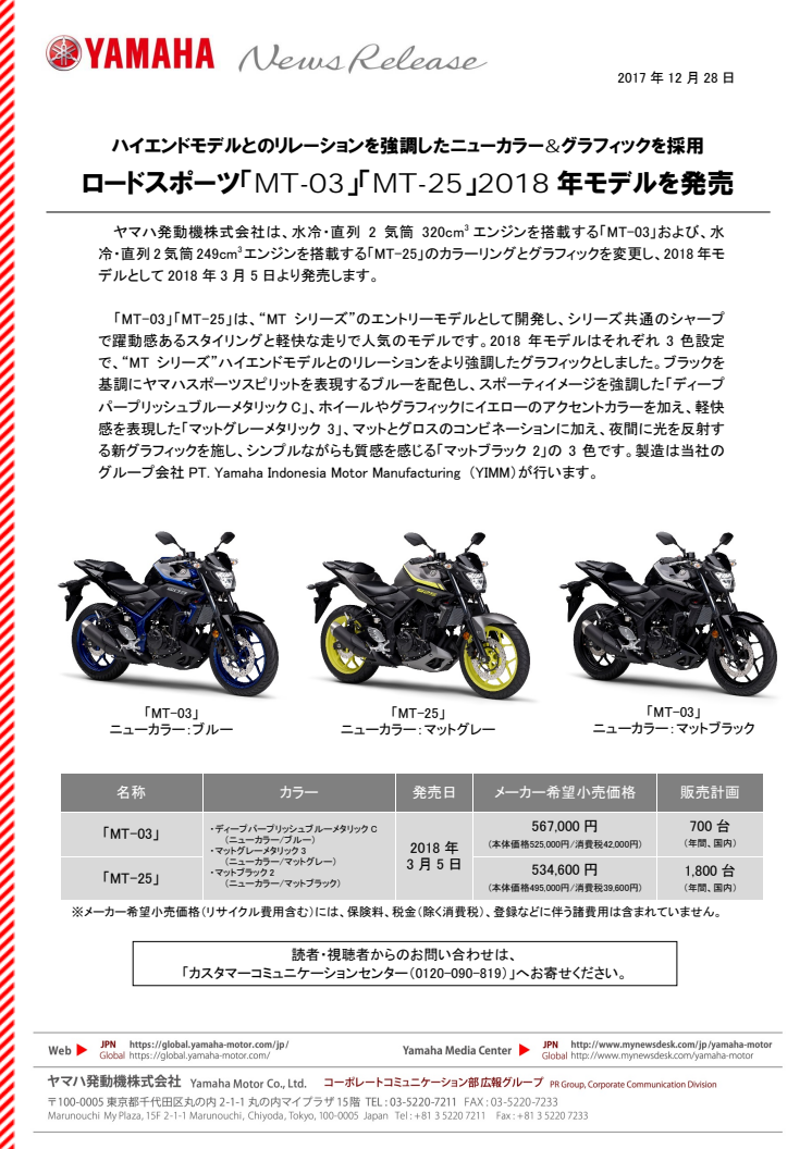 ロードスポーツ「MT-03」「MT-25」2018年モデルを発売 ハイエンドモデルとのリレーションを強調したニューカラー&グラフィックを採用