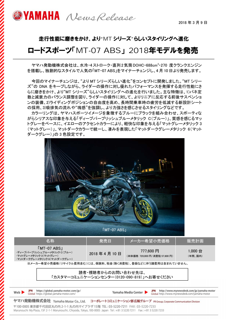 ロードスポーツ「MT-07 ABS」 2018年モデルを発売 走行性能に磨きをかけ、より“MTシリーズ”らしいスタイリングへ進化