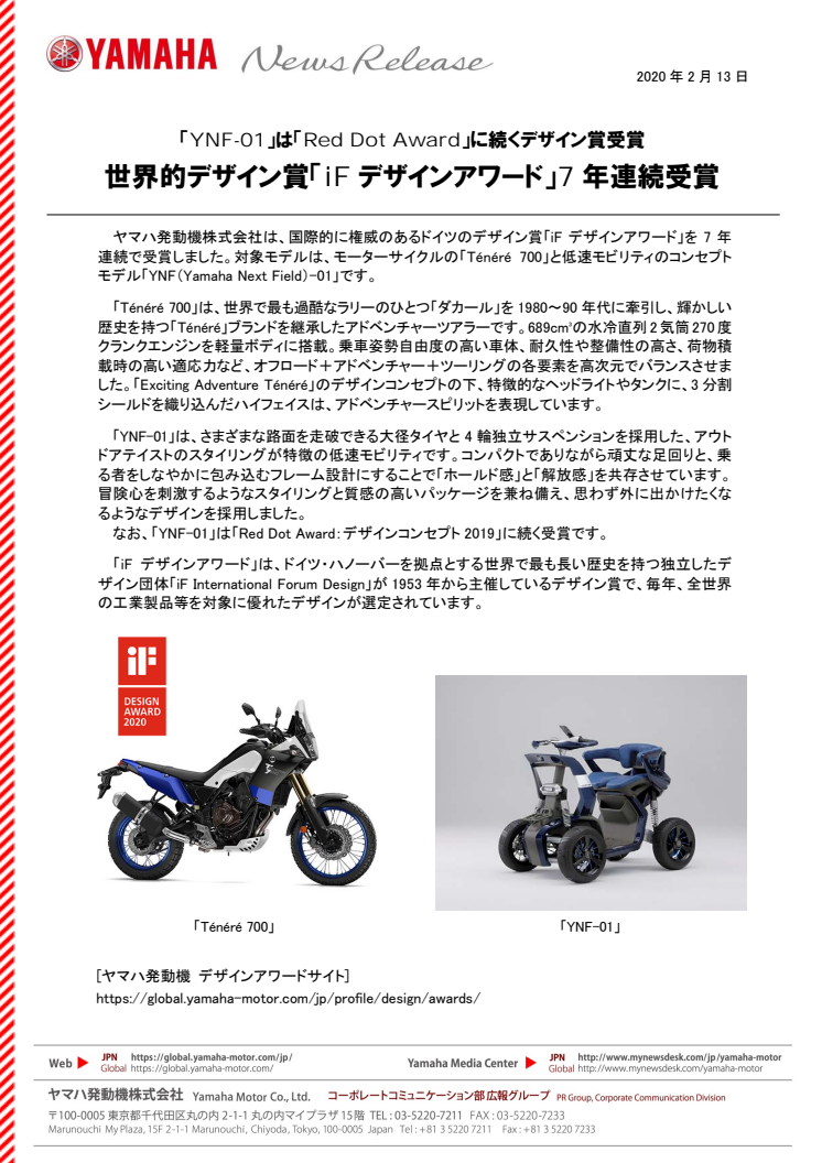 世界的デザイン賞「iFデザインアワード」7年連続受賞 「YNF-01」は「Red Dot Award」に続くデザイン賞受賞