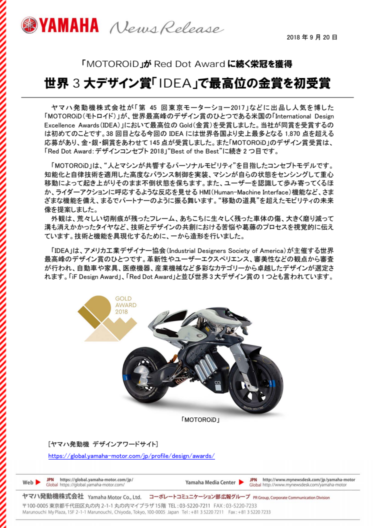 世界3大デザイン賞「IDEA」で最高位の金賞を初受賞 「MOTOROiD」がRed Dot Awardに続く栄冠を獲得