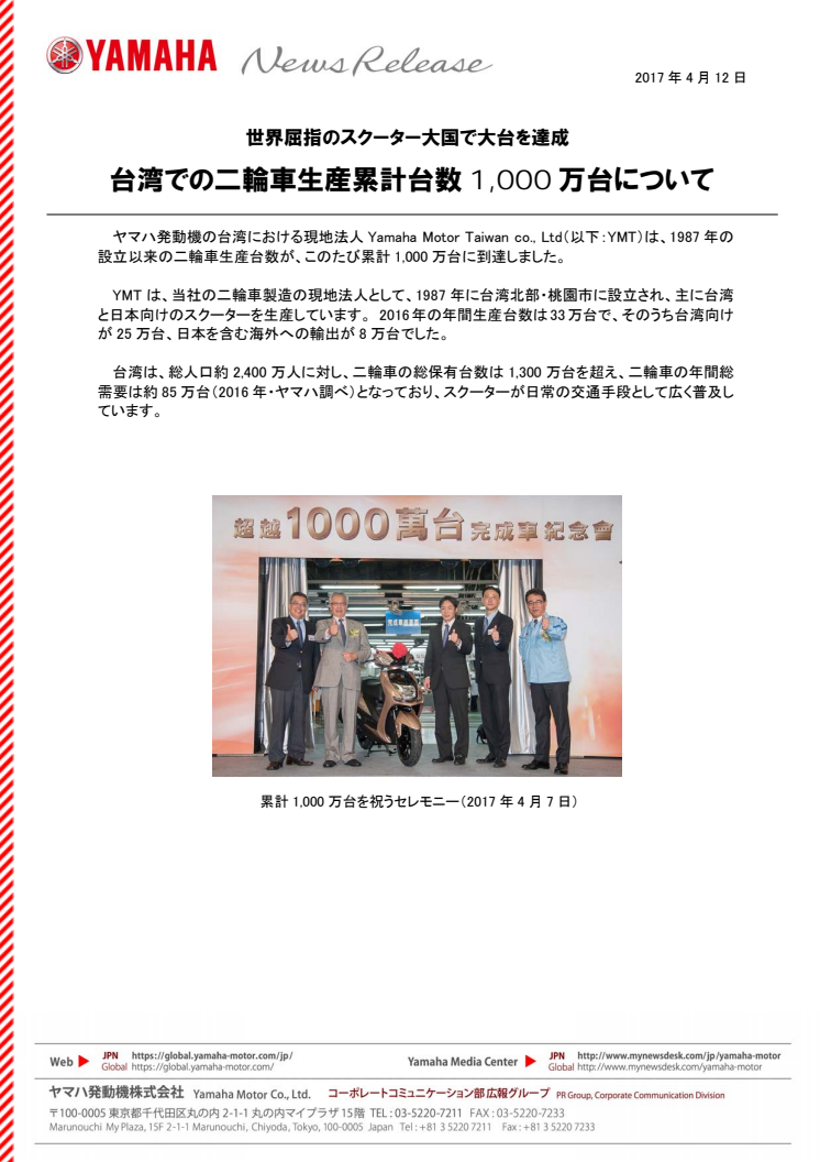 台湾での二輪車生産累計台数1,000 万台について 世界屈指のスクーター大国で大台を達成