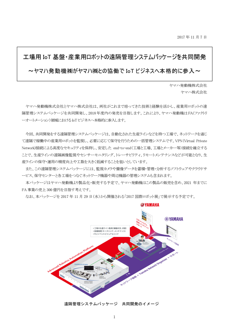 工場用IoT基盤・産業用ロボットの遠隔管理システムパッケージを共同開発 ~ヤマハ発動機㈱がヤマハ㈱との協働でIoTビジネスへ本格的に参入~