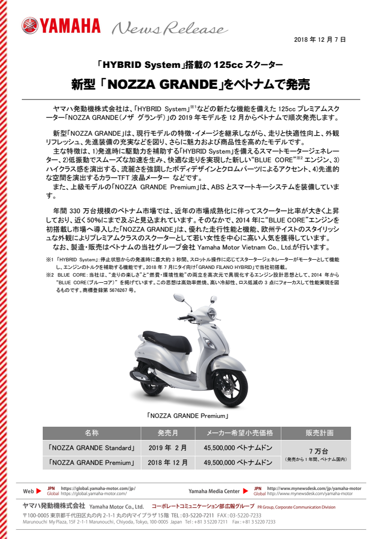 新型「NOZZA GRANDE」をベトナムで発売 「HYBRID System」搭載の125ccスクーター