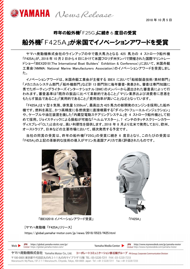 船外機「F425A」が米国でイノベーションアワードを受賞 昨年の船外機「F25G」に続き6度目の受賞