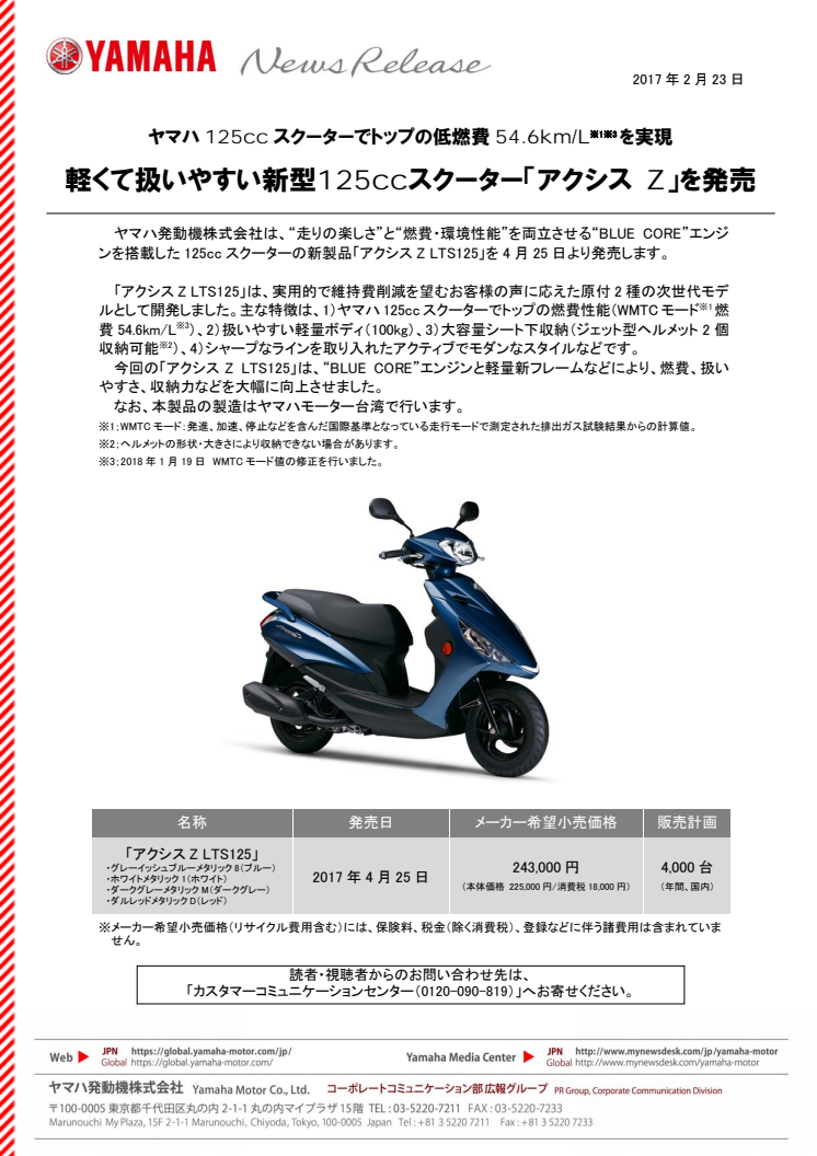 軽くて扱いやすい新型125ccスクーター「アクシス Z」を発売 ヤマハ125ccスクーターでトップの低燃費54.6km/L※1※3を実現