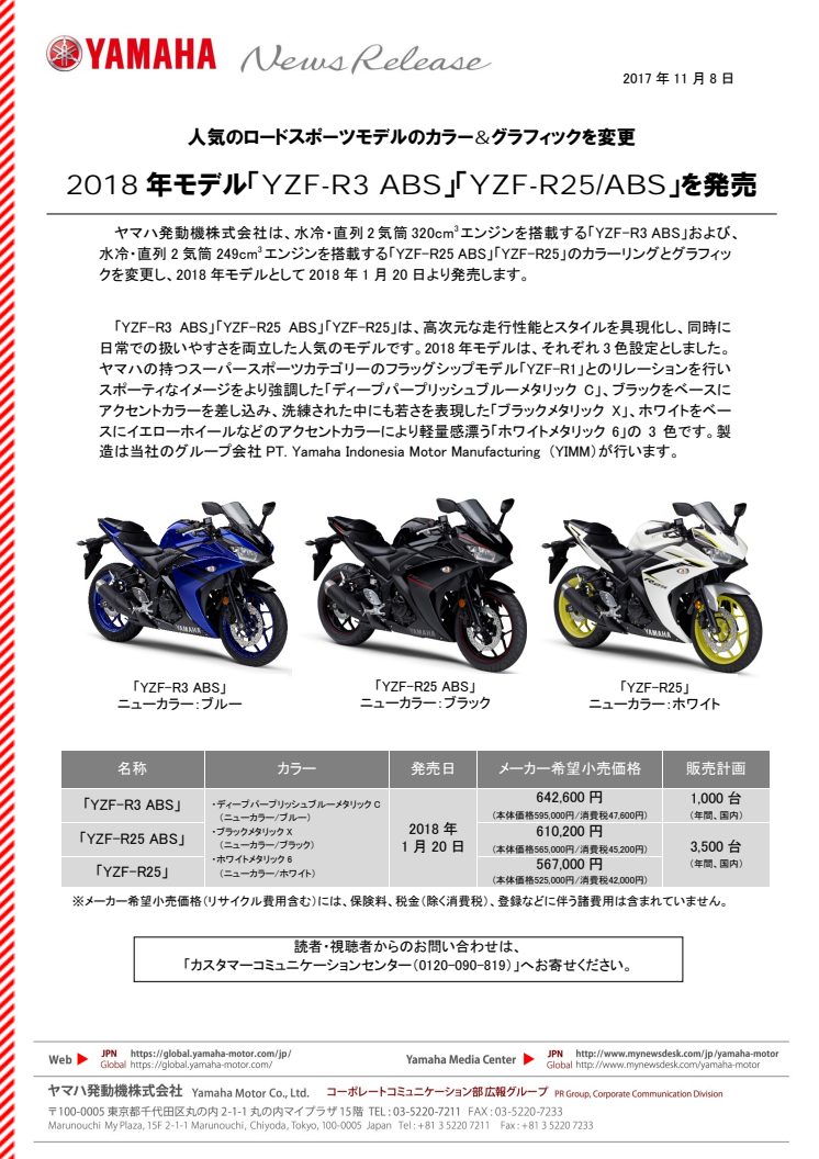 2018年モデル「YZF-R3 ABS」「YZF-R25/ABS」を発売 人気のロードスポーツモデルのカラー&グラフィックを変更