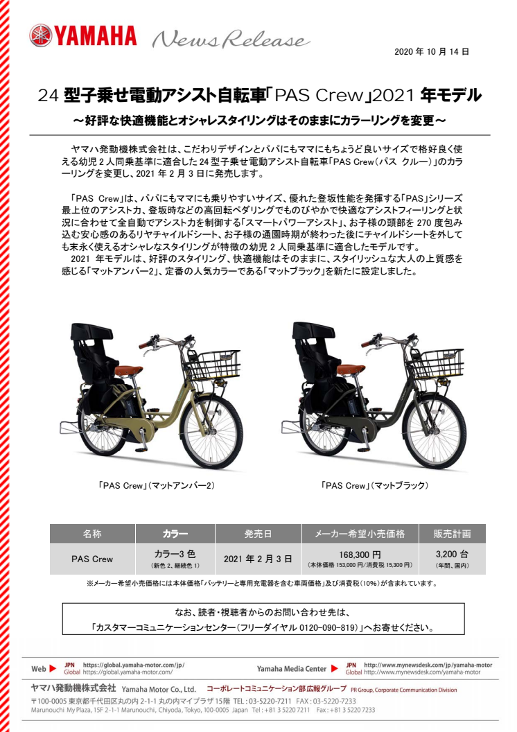 24型子乗せ電動アシスト自転車「PAS Crew」2021年モデル 〜好評な快適機能とオシャレスタイリングはそのままにカラーリングを変更〜